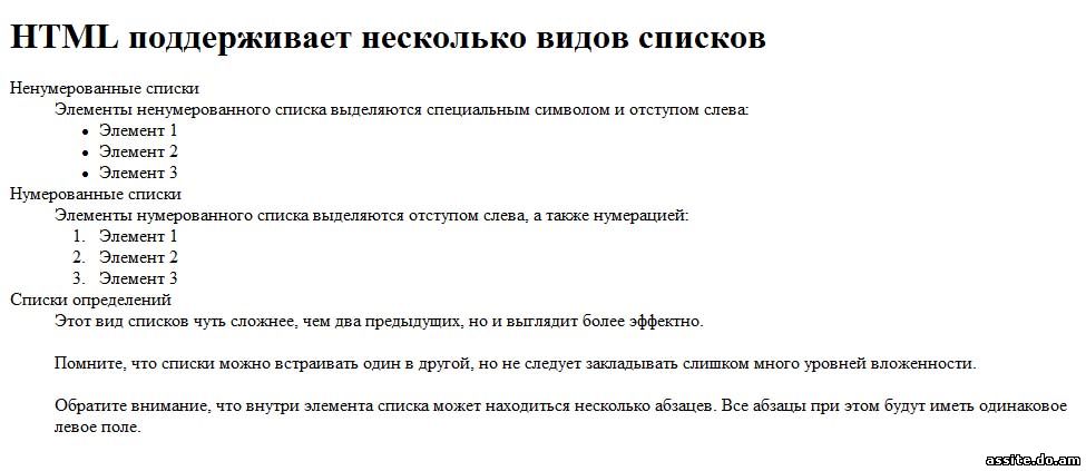 <H1>HTML поддерживает несколько видов списков </H1>